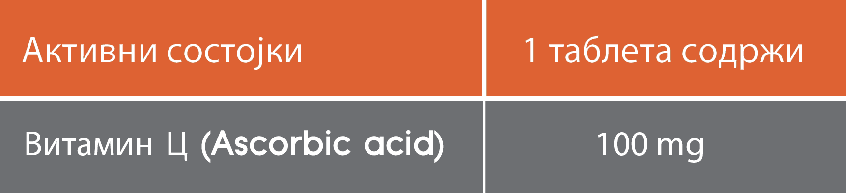 Состав: Аскорбинска киселина, микрокристална целулоза, пиливинилпиролидон, магнезиумови соли на масни киселини.