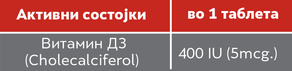 СОСТАВ: Витамин Д3, микрокристална целулоза, поливинилпиролидон, магнезиумови соли на масни киселини.